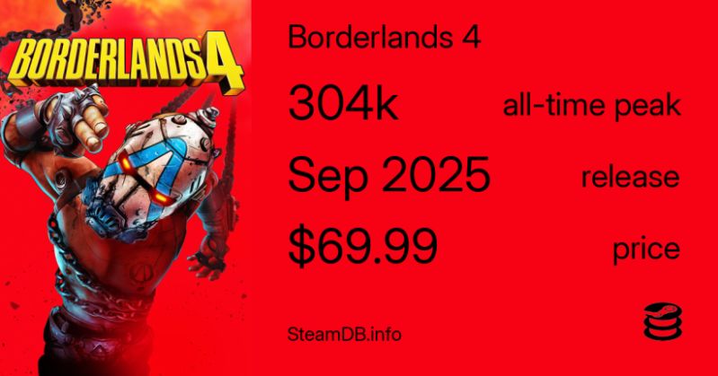 Od tego pisma, Borderlands 4 osiągnął nowy szczyt 304 398 równoczesnych graczy. Osiągnął ten rekord w ostatnią niedzielę, 14 września 2025 r., 19:50 UTC.