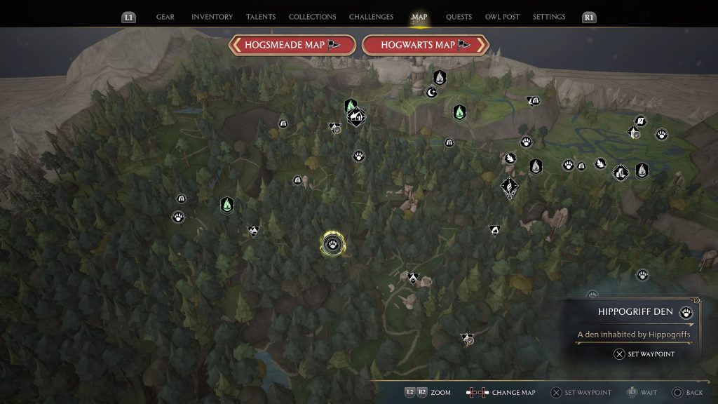 hipogryf: Legowisko znajduje się na wysokim wzgórzu na wschód od Zachodniego Zakazanego Lasu Fiuu Flame. Te duże stworzenia są trudne do schwytania. Użyj oszałamiających zaklęć, aby schwytać.
