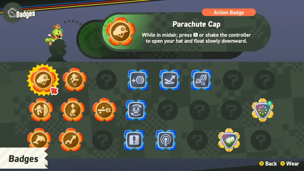 - Odskok bezpieczeństwa — Pozwala graczowi raz po każdym upadku odbić się od dołów, lawy lub trucizny. Można go kupić w Sklepie Poplin po ukończeniu kursu sterowca w Świecie 2 za 100 monet kwiatowych.