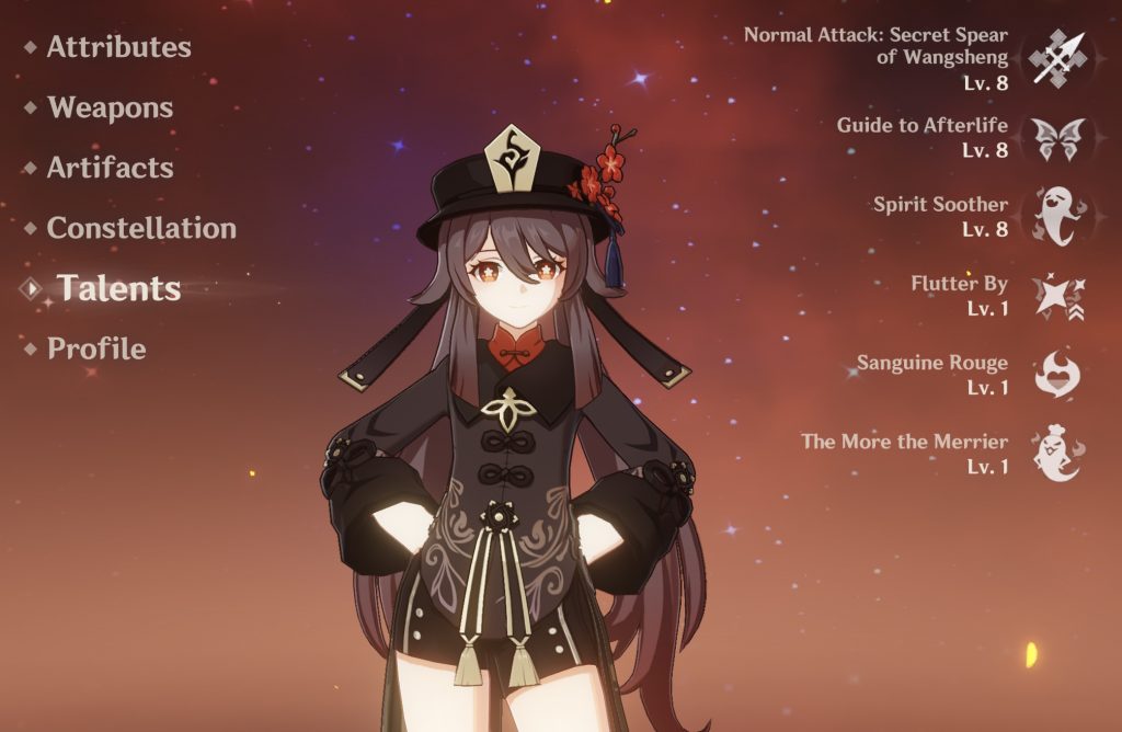 Obrażenia zadawane przez Hu Tao zależą od jej Umiejętności Żywiołów i Normalnego Ataku. Zwiększenie jej talentu Umiejętności Elementarnej wpłynie na jej DMG Krwawego Rozkwitu, podczas gdy zwiększenie jej Talentu Normalnego Ataku wpłynie na jej obrażenia podczas stanu Paramita Papilio.