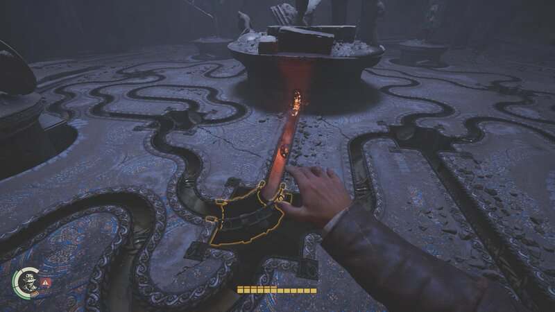 Używając bicza do szarpnięcia miecza, spowodujesz, że piłka płonąca zacznie się toczyć przez rowy. Istnieją 3 rury, które można odebrać i umieścić na określonych skrzyżowaniach. Dwie z tych rur są zakrzywione, a jedna jest prosta. Będziesz musiał umieścić je we właściwym miejscu i we właściwym czasie, aby stworzyć ścieżkę, która pozwala piłce osiągnąć wszystkie posągi w jednej podróży i we właściwej kolejności.
