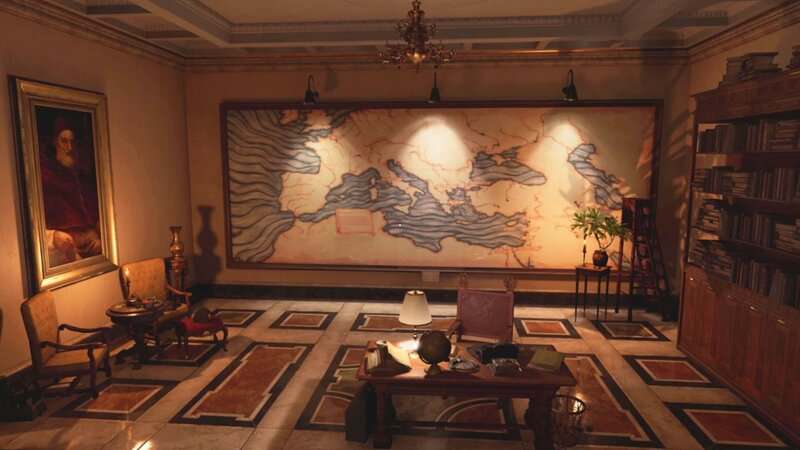 Gdy dotrzesz do Villa Pia i oficjalnie rozpoczniesz zadanie przygodowe, udaj się na zachodni koniec pierwszego piętra, aby znaleźć duży mural przedstawiający mapę na tylnej ścianie. Jest to mapa wbudowana puzzle.