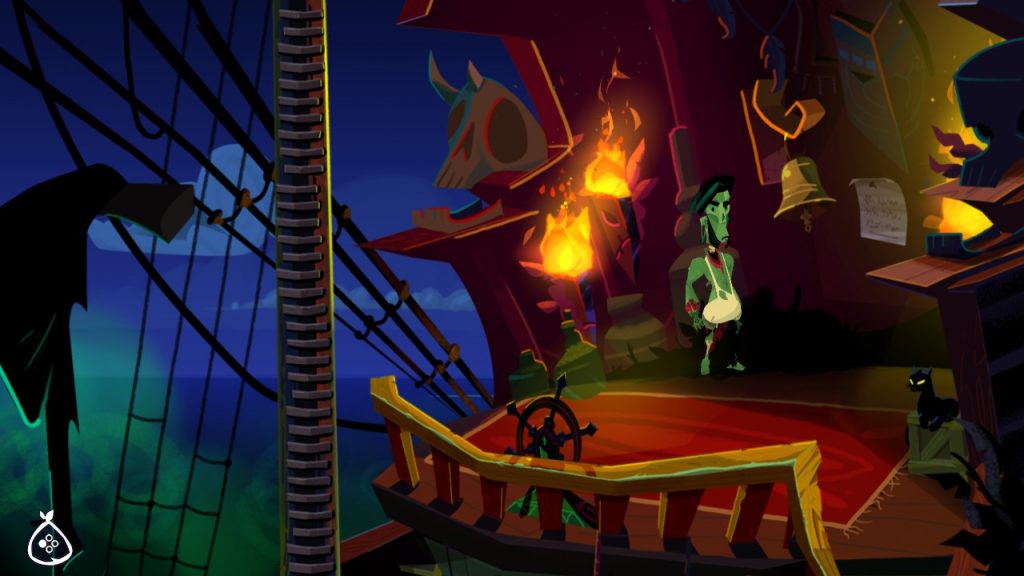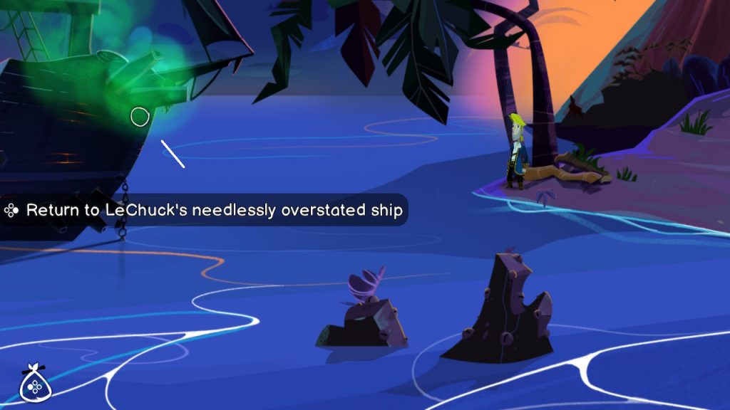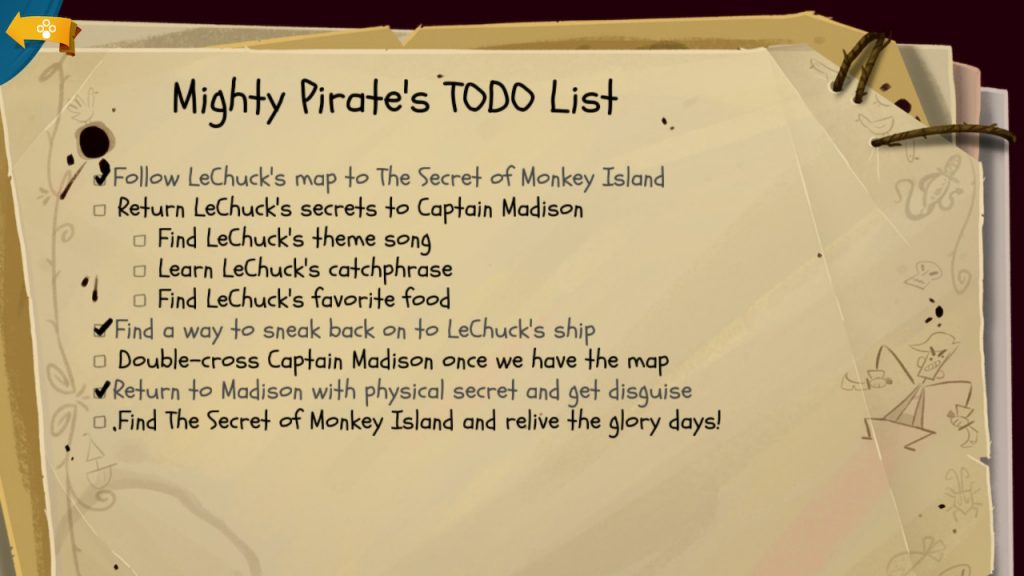 Podobnie jak inne zadania w Powrót na Małpie Wyspy, możesz przejść do następnej sekcji w dowolnej kolejności. Musisz znaleźć piosenkę przewodnią LeChucka, jego hasło i ulubione jedzenie. Wszystkie odpowiedzi znajdziesz na jego statku. Gdy zdobędziesz wszystkie trzy, wróć do przywódców piratów.