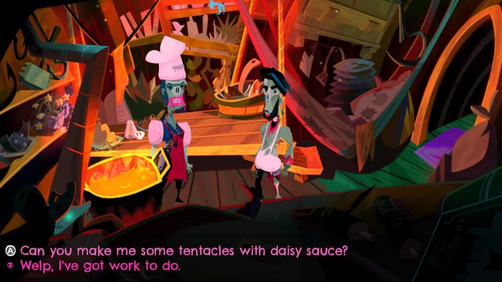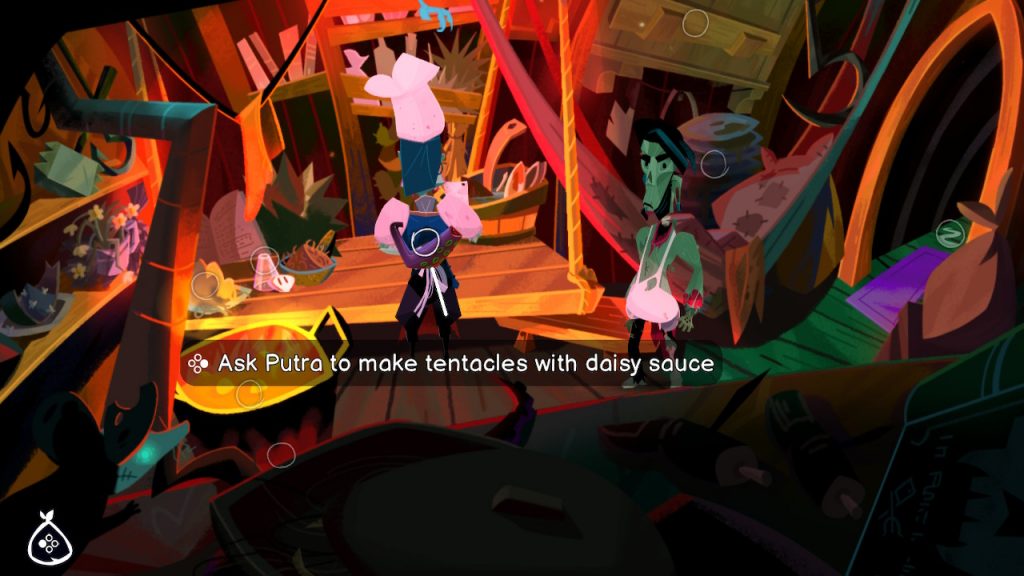 Idź do kuchni i porozmawiaj z Putrą. Zapytaj o ulubione jedzenie LeChuck, a powie ci, że nigdy wcześniej nie interesowałeś się jej talentami. Mówić „Jesteś najlepszym szefem kuchni, jakiego kiedykolwiek znałem” i będzie tak wdzięczna, że poda Ci nazwę ulubionego dania LeChucka: macki z sosem stokrotkowym. Poproś ją, żeby zrobiła.