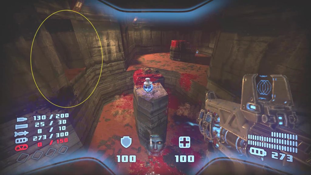 Powyższy zrzut ekranu został rozjaśniony, aby był łatwiejszy do zobaczenia, ale ta zakreślona część ściany jest w rzeczywistości bardzo dobrze ukrytym wejściem do jaskini. Możesz do niego wskoczyć z drugiego filaru, który zabierze cię z powrotem na początek poziomu i ukrytą kamizelkę pancerną.
