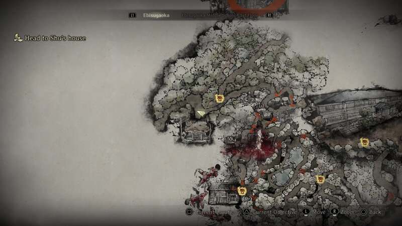 Statua Jizo: Kontynuując, poszukaj dwupiętrowego domu przypominającego chatę zaznaczoną lampy ulicznej na wschód od domu Shu. W górę kamiennych schodów znajdziesz posąg Jizo. Znajdziesz go przed dotarciem do głównej wioski na wschód.