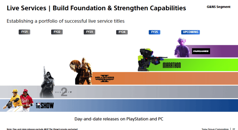 Jak udostępniono Bareless_Main3 w Subreddit Gamingleaksandrumours, Sony podzielił się prezentacją na niedawne spotkanie inwestorów. Na tym slajdzie, który mieliśmy poniżej zrzutu ekranu, wyraźnie to widzimy Maraton nadchodzi w tym roku budżetowym (przed 1 kwietnia 2026 r.) i Fairgame$ jest oznaczone jako „nadchodzące”.