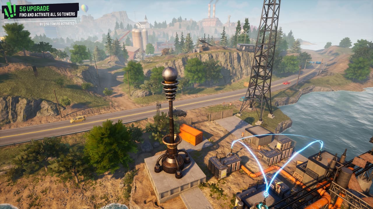 Aby aktywować wieżę 5G, musisz podłączyć małe węzły do prądu. Po wejściu do elektrowni zobaczysz zepsutą skrzynkę przyłączeniową. Jeśli podejdziesz blisko, zostaniesz porażony prądem i przez krótki czas będziesz nosił ze sobą prąd. Będziesz musiał przejść przez elektrownię, biegając po ścianach, nawigując po małych belkach i używając skrzydeł, aby połączyć wszystkie trzy małe węzły.